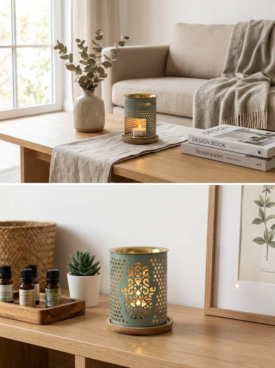 Den eleganta designen i metall, tillsammans med en träbas och kopparfärgad behållare, ger ett varmt och harmoniskt uttryck som passar både moderna och spirituella miljöer.