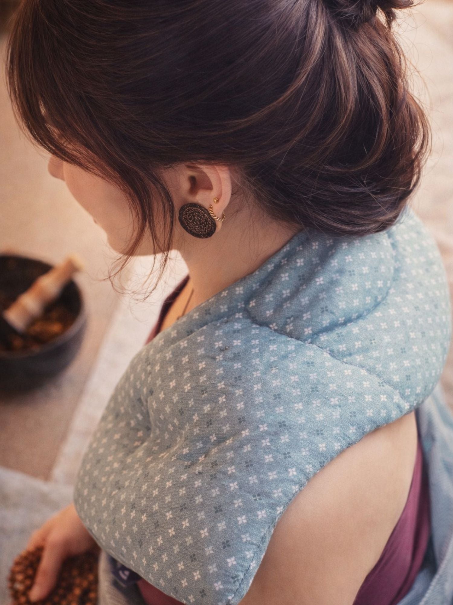 Till skillnad från värmeflaskor och traditionella vetekuddar ger de små vetekornen, tillsammans med den speciellt designade passformen med fack, en extra flexibel och behaglig användning i axel- och nackområdet. Kudden vilar nära och mjukt mot kroppen och följer dess naturliga konturer.