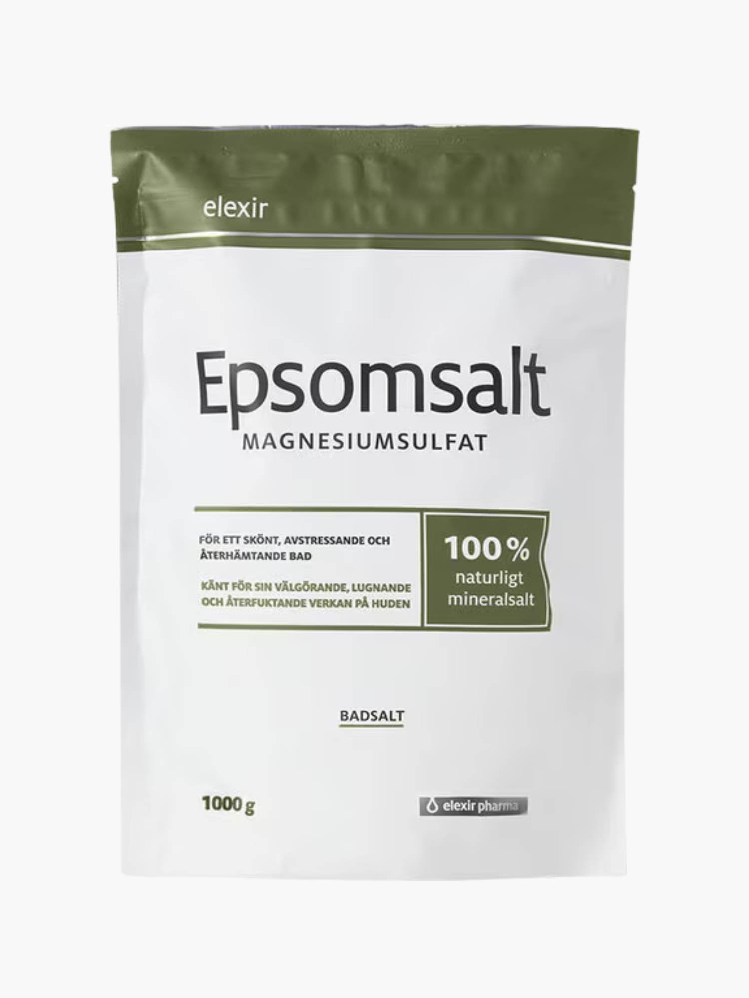 Epsomsalt 1000 g är ett rent badsalt bestående av 100 % magnesiumsulfat. Används i bad eller fotbad för en avslappnande stund. Saltet löser sig i vatten och frigör magnesium-, svavel‑ och syre‑joner som ger en lugn känsla för hud och sinne.
