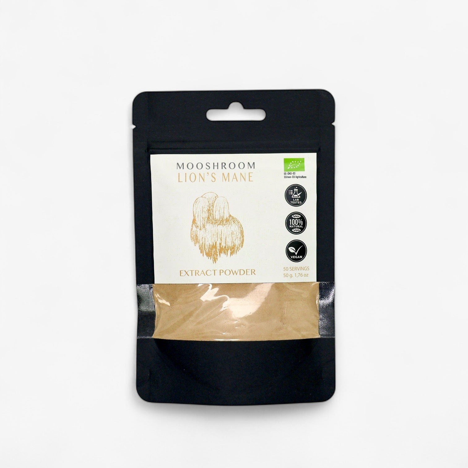 Kosttillskott - 50 g. Innehåller 50 dagliga doser á 15 g färsk Lion's Mane per dos. Organiskt* 15:1 dubbelextrakt** av 750 g Lion's Mane (Hericium erinaceus).