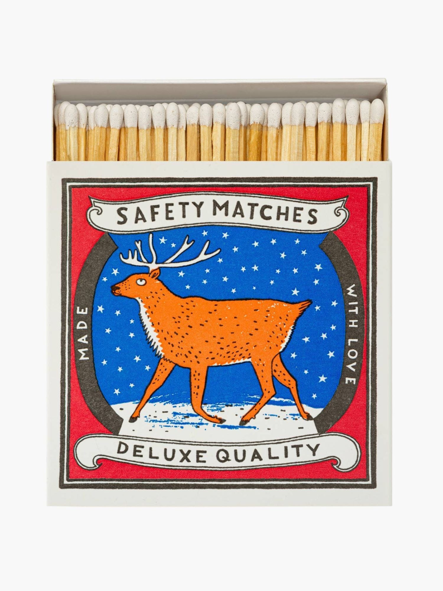 Signaturtändstickor i fyrkantigt format med en ren som vandrar genom snön under en stjärnklar natt, tillsammans med texten ”Safety Matches, Made With Love, Deluxe Quality.”