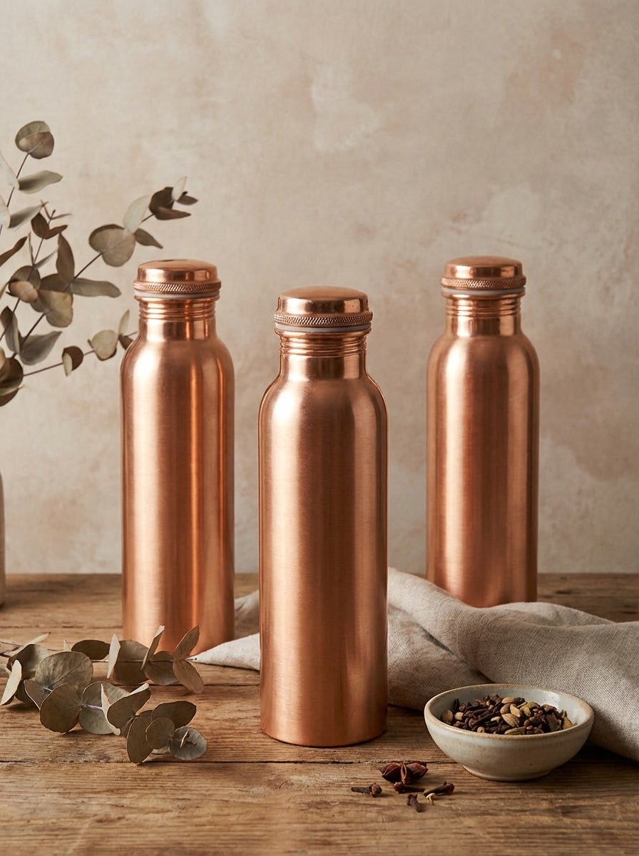 Ayurvedisk vattenflaska i hamrad koppar. Inom Ayurveda anses dricksvatten från en kopparflaska tillföra helande egenskaper. Enligt ayurvediska läror balanserar kopparvatten de tre doshorna (Vata, Pitta och Kapha), stärker immunförsvaret, bromsar åldringsprocessen och stimulera hjärnan att fungera genom en naturlig antioxidant.